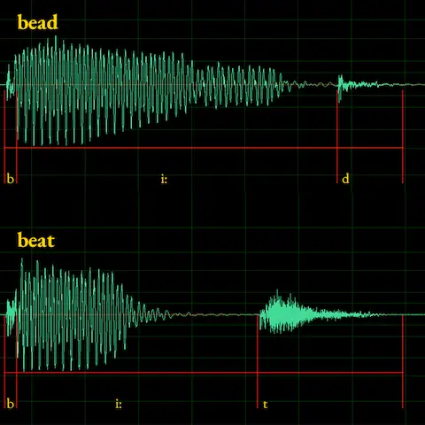 例如,“beat /biːt/” 中的元音 /iː/ 会比“bead/bid/”中的元音/i/短,因为/t/是清辅音,而/d/是浊辅音。